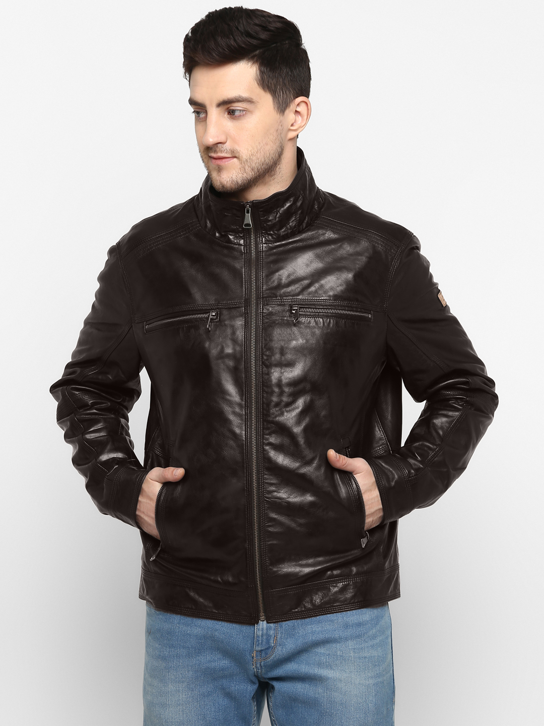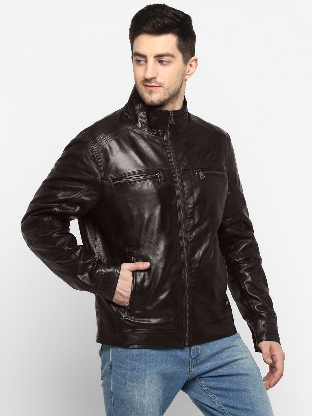 A high quality genuine Leather Jacket in dark brown colour with premium zipper and hardware along with designer quilted lining. Precisely detailed outer body compliments your style statement, every time you wear this jacket. A quality addition to your wardrobe which may last for several years and goes better with every usage just line old wine. hope you will enjoy a purely Made In India "Carnieblaze" leather stuff.